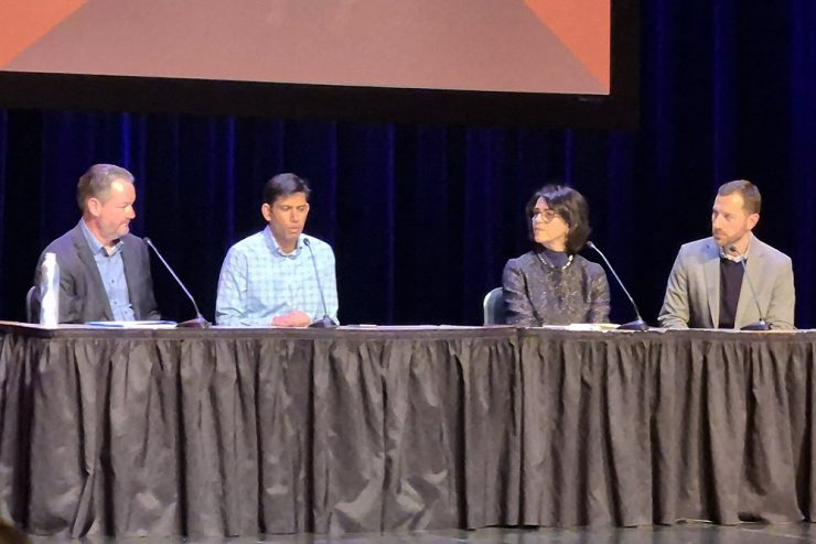 Panelists (from left): Paul Fain; Lav Varshney, director of the AI Innovation Institute; Marianna Savoca, associate vice president