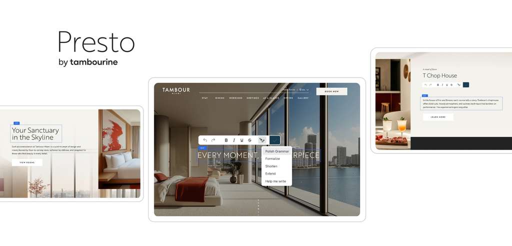 Presto was built to put control back in the hands of marketers and creators. Instead of navigating layers of back-end systems, they can now edit visually and rely on the integrated AI to instantly polish their copy, ensuring brand consistency and perfect grammar. This means every piece of content is instantly optimized, right where the guest engages. Christina Davis, Senior Vice President of Product and Operations at Tambourine
